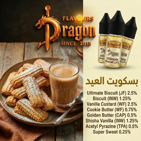 استعد لتجربة فريدة تعيدك إلى ذكريات الطفولة وأجواء العيد الدافئة مع ريسبى “بسكويت العيد” (One Shot) من Dragon Flavours. لقد قمنا بتركيب هذه النكهة بعناية فائقة لتجسد الطعم الأصيل لبسكويت العيد الهش واللذيذ، ممزوجاً بلمسة سحرية من الفانيليا الغنية والزبدة الفاخرة التي تذوب في الفم.